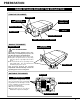 PREPARATION NAME OF EACH PART OF THE PROJECTOR FRONT OF THE CABINET SPEAKERS INFRARED REMOTE RECEIVER POWER CORD CONNECTOR PROJECTION LENS MAIN ON / OFF SWITCH LENS COVER CARRYING HANDLE LEVEL AND TILT ADJUST HANDLE BACK OF THE CABINET EXHAUST VENT INFRARED REMOTE RECEIVER HOT AIR EXHAUSTED ! Air blown from the exhaust vent is hot. When using or installing the projector, the following precautions should be taken. ● Do not put a flammable object near this vent.