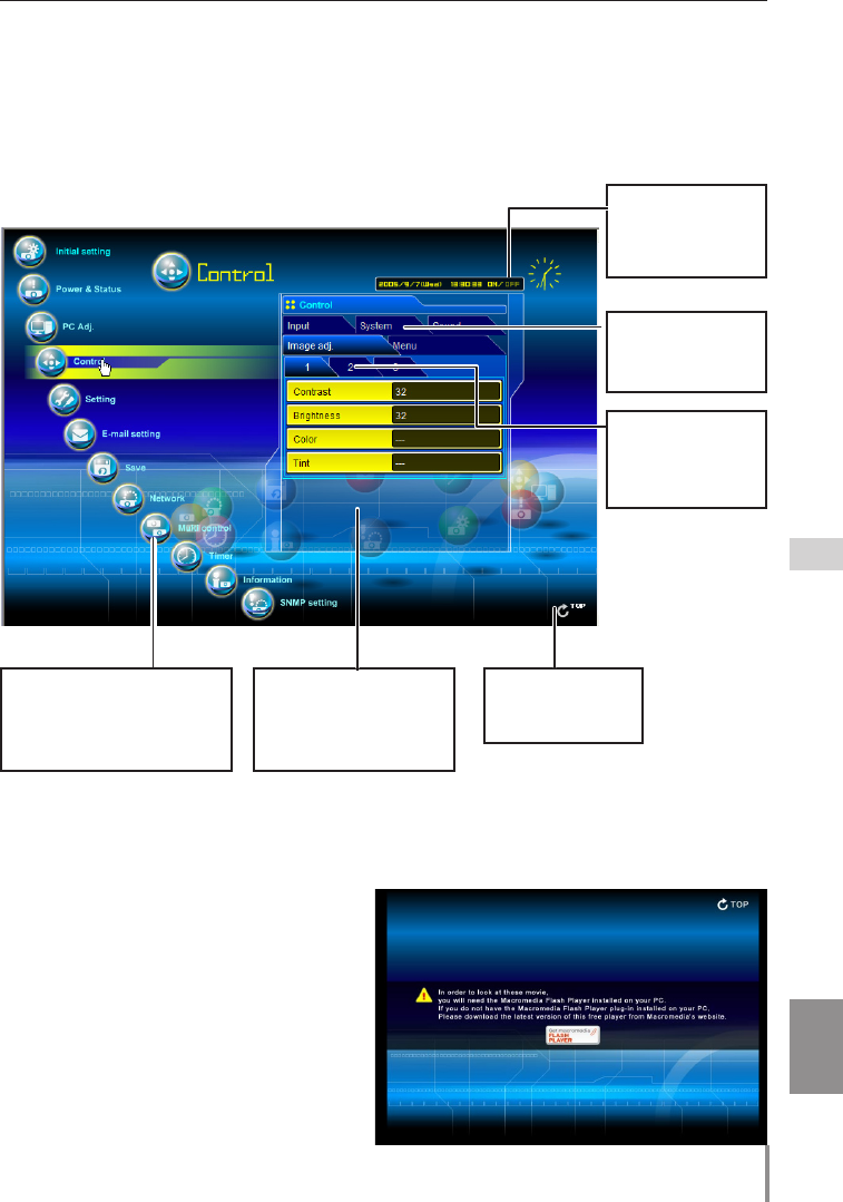 selection. Perform various kinds of settings through this page. Click on the menus to dis-