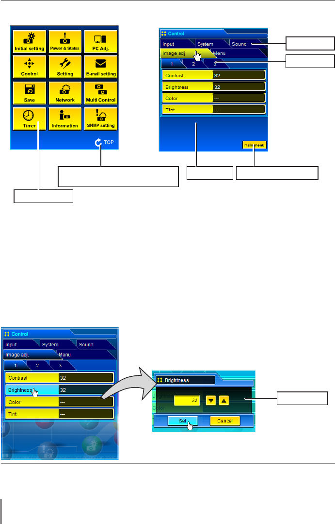 To control and set up the projector, use the setting menus on the web browser. Describes the