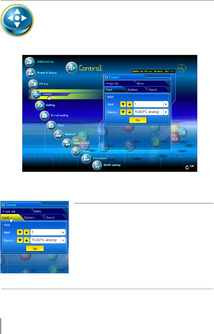 ✐ The control page displays valid control items depending on the selected input mode, signal