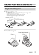 SHOOT, PLAY BACK AND SAVE Prepare the battery pack 1 Charge the battery pack. The CHARGE indicator shows the battery pack charge status. h Lights red during recharging. h Turns off when battery pack is fully charged. h The charging time is approx. 90 minutes. CHARGE indicator [o] mark CHARGE indicator Battery pack Socket Power cord 2 Insert the battery pack.