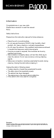 P4000 Information Congratulations on your new radio. Please take a moment to read this manual Enjoy. Safety Instructions. Please store this instruction manual for future reference. • Place the unit on a solid surface • Do not expose Scansonic P4000 to high humidity, direct sunlight, dirt, heavy vibration or extreme temperatures. • Do not open the cabinet. Only qualified technicians are allowed to handle this Scansonic radios internal parts.