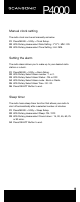 P4000 Manual clock setting The radio clock can be set manually as below. 01 Press MENU > Utility > Clock Setup. 02 With Rotary please select Date Setting : YYYY : MM : DD. 03 With Rotary please select Time Setting : HH : MM. Setting the alarm The radio alarm allows you to wake up to your desired radio station or a buzz. 01 02 03 04 05 06 Press MENU > Utility > Alarm Setup. With Rotary Select Alarm number : 1 or 2. With Rotary Select Alarm Status : ON or OFF. With Rotary Select Alarm mode : Buzz or Radio.