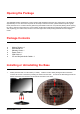 Opening the Package The SCEPTRE X246 is packaged in a carton together with standard accessories. The weight of the LCD display is approximately 13.1 lbs. Since the LCD panel can be easily scratched or broken, please handle the product gently. Never place the unit on a surface with the glass facing downwards unless it is on a protective padding. When opening the carton, make sure the product is in good condition and that all the standard accessories and items are included.