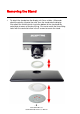 Removing the Stand 1. To attach the stand place the display unit flat on a table. Afterwards attach the plastic ring onto the neck, then the stand onto the display. Also attach the thicker plastic ring to the bottom of the stand and the metal plate to cover up the plastic ring. Be sure to match the three fitting holes with the neck and screw in the 5 screws to secure the stand. -8www.SCEPTRE.