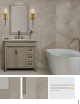 The clean and modern look of QUADEC profiles in matte white frame the vanity countertop, pony wall, and shower niche. JOLLY protects the outside edges of the shower wall, while DILEX-EKE acts as a transition from floor to wall in the shower.