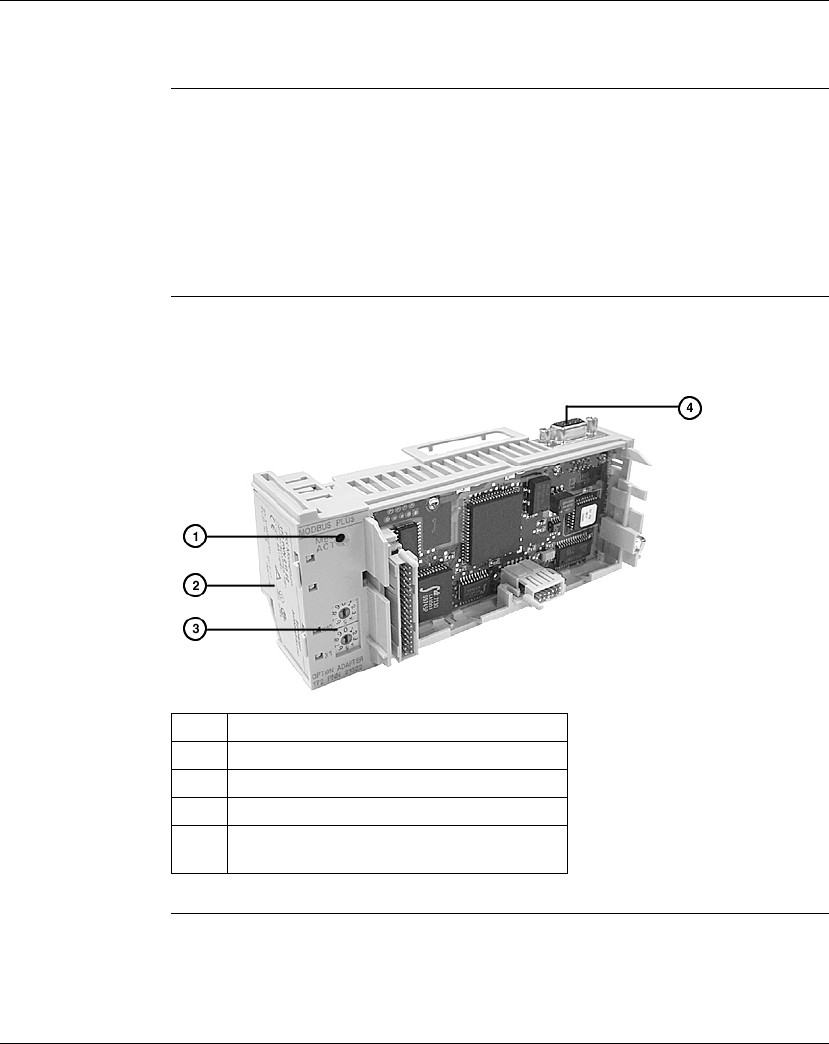 Illustration The illustration below shows the LED indicator, address switches, Modbus Plus