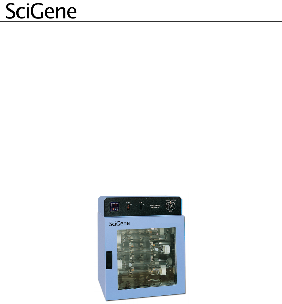 Model 400 Hybridization Incubator — USER MANUAL Serial Number The following serial number identifies the specific instrument you have purchased and must be referenced when requesting service. A copy is affixed to the instrument. Technical Service: (408) 733-7337, techserv@scigene.com Warranty SciGene warrants that the rotating oven described in this manual shall be free of defects in materials and workmanship for a period of 12 months from date of delivery.