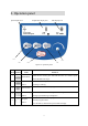6. Operation panel Speed display area Temperature display area 14000rpm 25 Time display area 12 min ℃ (1) (5) (2) (4) (3) Figure 6-1 Operation panel Item 1 2 3 4 5 Symbol Name Pulse button Open/ lock Function When the door closed, press and hold the button to accelerate speed, release the button to stop it. Press the button to open the door. The button is not available when the button centrifuge is running. Select button Press the button to choose the program which you want to modify.