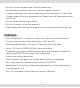 • Do not use the camera near harmful chemicals. • Do not place product near any strong magnetic objects • It might influence the normal operation of the product if used at the fringe range of normal temperature. Please turn off the power when not in use. • Do not disassemble the product. • Do not shake or strike the product. • Please obey the local government’s environment protection policy. Features • Cost-effective D.I.Y.