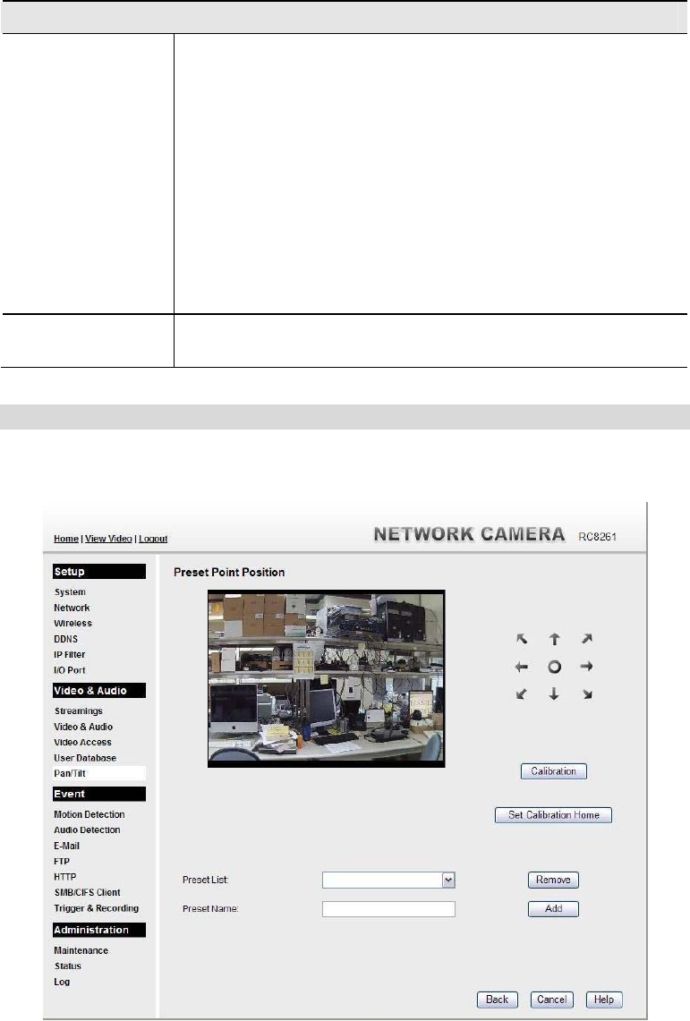 This screen is displayed when the Preset Point Position button on the Pan/Tilt screen is