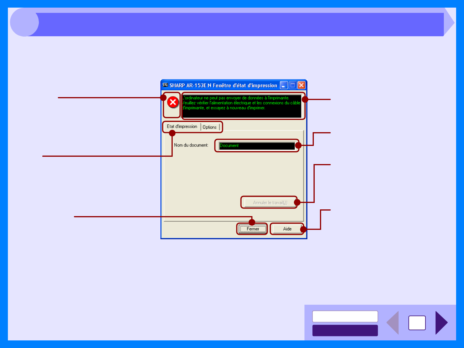 document en cours d'impression ainsi que tout message d'erreur éventuel.