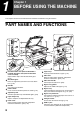 BEFORE USING THE MACHINE 18 19 20 21 22 1 23 24 26 28 27 29 25 16 17 18 19 20 21 22 23 24 Parallel port Connect to your computer to use the printer function. (Software Setup Guide) USB 2.0 port (when the dual function board is installed) Connect to your computer to use the printer and scanner functions. (Software Setup Guide) Document feeder tray (when the SPF/RSPF is installed) Place the original(s) that you wish to scan face up here. Holds up to 40 originals.
