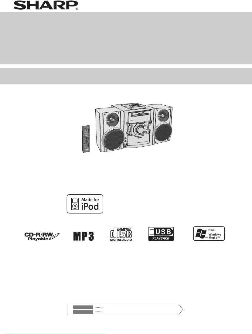 MINI COMPONENT SYSTEM SISTEMA MINI MODEL MODELO CD-DH790N OPERATION MANUAL MANUAL DE MANEJO ENT SYSTEM MINI COMPON CD-DH790 FUNCTION POWER ON/STAND-BY VOL PUSH OPEN CD USB AUDIO IN PHONES TAPE iPod is a trademark of Apple Inc., registered in the U.S. and other countries. ENGLISH Please refer to pages i to ii and E-1 to E-21. ESPAÑOL Consulte las páginas i a ii y S-1 a S-21. SHARP CORPORATION Downloaded From Disc-Player.