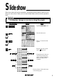 Features S lide show Slide show assists with teacher preparation. By selecting from the built-in options or creating your own series of slides, you can demonstrate lessons with minimum preparation time. Example Use the built-in slide show of y = x2 to show how the coordinates change as you move along the graph. Key Operation 1 2 Display Notes Specified SLIDE SHOW mode. Select the built-in menu. Pen Touch 3 Select y = x2 and the first slide appears.