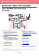 BEFORE USING THE MACHINE BEFORE USING THE MACHINE User Control . . . . . . . . . . . . . . . . . . . . . . . . . . . . . . 1-38 • User List . . . . . . . . . . . . . . . . . . . . . . . . . . . . . . 1-38 • Default Settings . . . . . . . . . . . . . . . . . . . . . . . . 1-42 • Administration Settings. . . . . . . . . . . . . . . . . . . 1-46 • Actions when the user is authenticated . . . . . . 1-47 PART NAMES AND FUNCTION . . . . . . . . . . . . . . . 1-3 • EXTERIOR . . . . . . . . . . . . . .