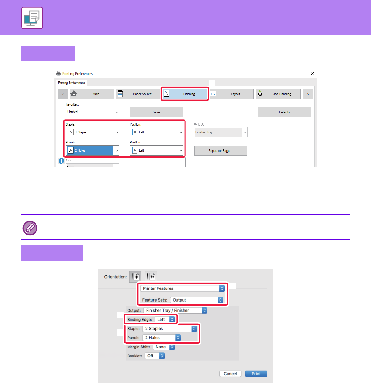 • For the staple function, select the number of staples in the "Staple" menu and the staple position in the“Position”menu.