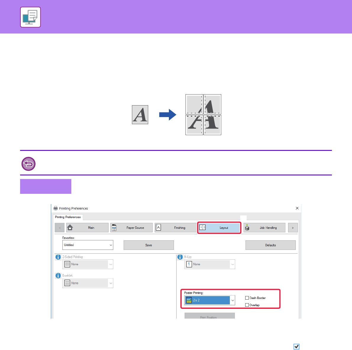 One page of print data is enlarged and printed using multiple sheets of paper (4 sheets (2 x 2), 9 sheets (3 x 3) or 16