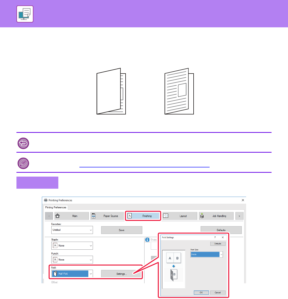 When printing data in a pamphlet layout, the "Booklet" function can be used to conveniently fold and staple printed output to