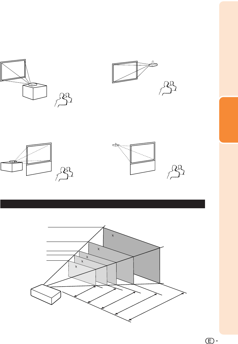The projector can use any of the 4 projection modes, shown in the diagram below. Select the mode