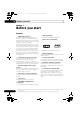 DV48AV_EN.book 01 8 ページ 2007年6月6日 水曜日 午前10時2分 Before you start Hints on installation We want you to enjoy using this product for years to come, so please use the following guidelines when choosing a suitable location: Please also note that recordable discs cannot be recorded using this player. DVD-Audio DVD-Video DVD-R DVD-RW CD-R CD-RW Do... • Use in a well-ventilated room. • Place on a solid, flat, level surface, such as a table, shelf or stereo rack. Audio CD Video CD Don’t...