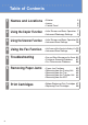 Table of Contents 1 Names and Locations 2 • Exterior • Interior • Control Panel 3 4 5 2 Using the Copier Function • Initial Screen and Basic Operation 7 • Advanced Photocopy Settings 9 3 Using the Scanner Function • Initial Screen and Basic Operation 12 • Advanced Scan Settings 18 4 Using the Fax Function • Initial Screen and Basic Operation for Sending a Fax 19 • Advanced Scan Settings 22 5 Troubleshooting • Error and Status Messages on the Screen 23 • Printing or Scanning Problems 27 • Fax Tran