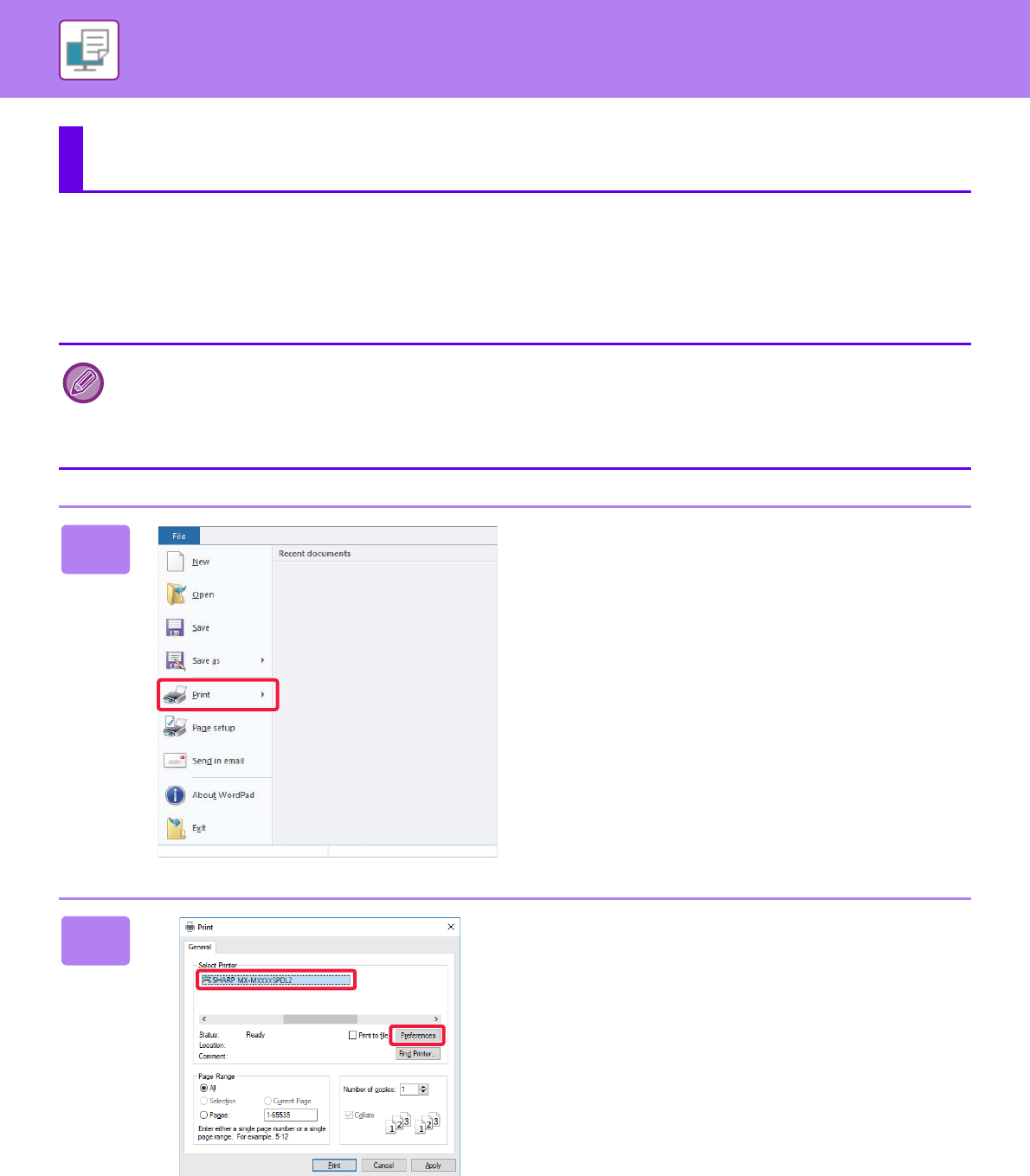 The following example explains how to print a document from "WordPad", which is a standard accessory application in