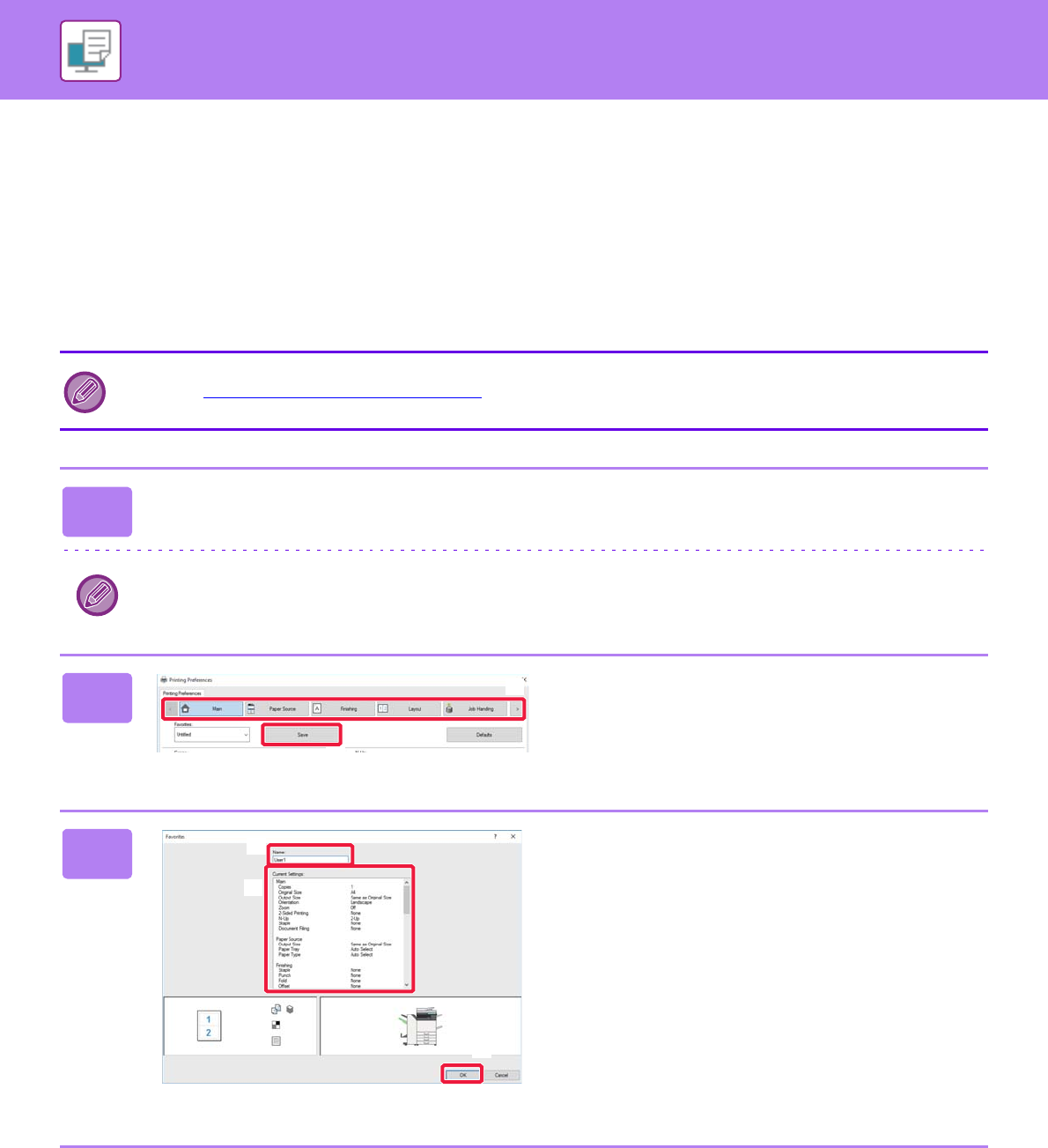 Settings configured on each of the tabs at the time of printing can be saved as Favorite. Saving frequently used settings