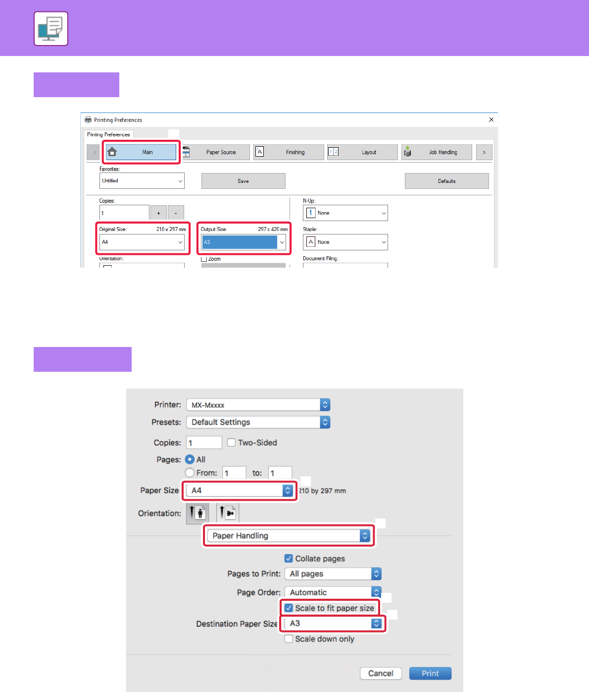 (3) Select the actual paper size to be used for printing from [Output Size] (for example: A3).