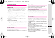 J410_insatsu.book 8 ページ 2006年8月29日 火曜日 午後5時28分 Charger 1 6 Charger & In-Car Charger « Grasp plug (not cord) to disconnect Charger. May cause fire/electric shock. « Keep cord away from heaters. Exposed wire may cause fire or electric shock. « Stop use if plug is hot or improperly connected. May cause fire/electric shock. « Keep In-Car Charger socket clean. May overheat and cause injury. 1 Use only the specified fuse. 1 1 Always charge handset in a well-ventilated area.