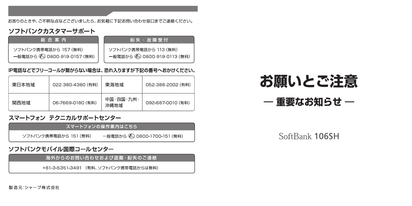 お買い上げ品の確認 ■ 106SH本体 ■ ACアダプタ(SHCEJ1) ■ クイックスタート ■ お願いとご注意(本書) ■ 保証書(本体/ACアダプタ) ■ microSDカード※(試供品) このたびは、SoftBank 106SHをお買い上げいただき、 まことにありがとうございます。 SoftBank 106SHをご利用の前に、本書をご覧になり、正しくお取 ■ 電池パック(SHBEJ1) り扱いください。 ■ PC 接続用 microUSB ケーブ ル(SHDDL1) 本書をご覧いただいたあとは、大切に保管してください。 SoftBank 106SHは、3G方式とGSM方式に対応しております。 ※お買い上げ時には、本機に取り付 けられています。 ※本書ではmicroSDカード(micro SDHC/microSDXCカードを含 む)を、以降「SDカード」と記載い たします。 . 本書の内容の一部でも無断転載することは禁止されております。 .