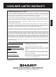 GARANTIE GARANTIE LIMITÉE LIMITÉE GARANTIE LIMITÉE Produits électroniques de grande consommation Merci d’avoir choisi la marque Sharp! Conditions : La présente garantie limitée ne s’applique pas : (a) Aux dommages occasionnés ou aux réparations requises sur les appareils qui ont fait l’objet d’un emploi abusif, de négligence, d’un accident, d’une installation inadéquate ou d’une utilisation non appropriée, tel qu’il est mentionné dans le manuel du propriétaire ou dans toute autre documentation applicable s