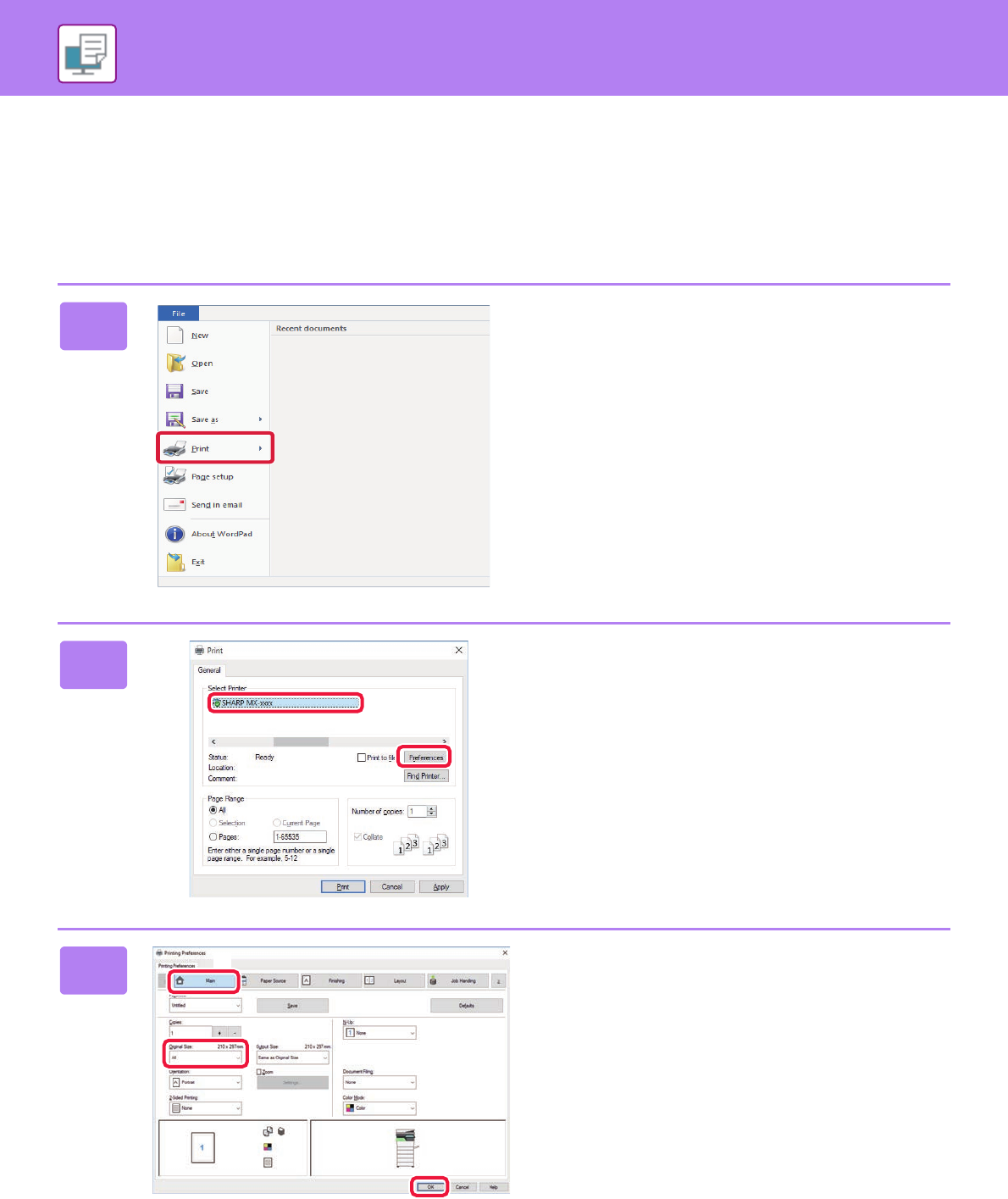 The following example explains how to print an A4 size document from "WordPad", which is a standard accessory