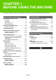 CHAPTER 1 BEFORE USING THE MACHINE This chapter provides information on basic operation procedures, how to load paper and machine maintenance. LOADING PAPER BEFORE USING THE MACHINE PART NAMES AND FUNCTIONS . . . . . . . . . . . . . . • EXTERIOR . . . . . . . . . . . . . . . . . . . . . . . . . . . . . • INTERIOR . . . . . . . . . . . . . . . . . . . . . . . . . . . . . • SIDE AND BACK . . . . . . . . . . . . . . . . . . . . . . . . • OPERATION PANEL . . . . . . . . . . . . . . . . . . . . .