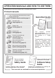 OPERATION MANUALS AND HOW TO USE THEM 3 printed manuals and a manual in PDF format are provided with the machine. Printed manuals To learn the parts of the machine and how to use them To load paper Before using the machine (page 7) Quick Start Guide (this manual) To make a copy Copying (page 21) To print a file Printing (page 41) To send a fax This manual provides easy-to-understand explanations of the functions of the machine in a single manual.