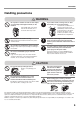 CAUTIONS Handling precautions WARNING Do not place a container of water or other liquid, or a metal object that might fall inside, on the machine. If the liquid spills or the object falls into the machine, fire or electrical shock may result. If you notice smoke, a strange odor, or other abnormality, do not use the machine. If used in this condition, fire or electrical shock may result. Immediately switch off the main power and remove the power plug from the power outlet.