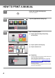 HOW TO PRINT A MANUAL Press the [Home Screen] key. 1 Home screen appears. 2 10:15 Easy Copy CLOUD PORTAL Toner Quantity Bk C M Operation Y Guide Enlarge Display Mode Easy Scan Operation Settings Settings Enlarge Total Count Guide Display Mode Tap the [Operation Guide] key. Easy Fax Total Count Job Status Job Status Brightness Brightness Adjustment Adjustment Set in a touch panel. 3 (1) Tap the [Downloading and printing manuals] key. (1) (2) Tap the [Other manuals] key.