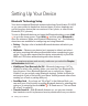 Setting Up Your Device Bluetooth Technology Setup ® Your device supports Bluetooth wireless technology Specification 2.0+EDR so you can connect to hands-free devices (stereo or mono headsets and car kits) and any device that can receive a vCard, photo, or other file via Bluetooth (PCs, phones). To turn on Bluetooth features and open the Bluetooth settings, press JUMP to go to the Jump screen. Press MENU and then select Bluetooth to open the submenu. Make sure Bluetooth features are “on”.