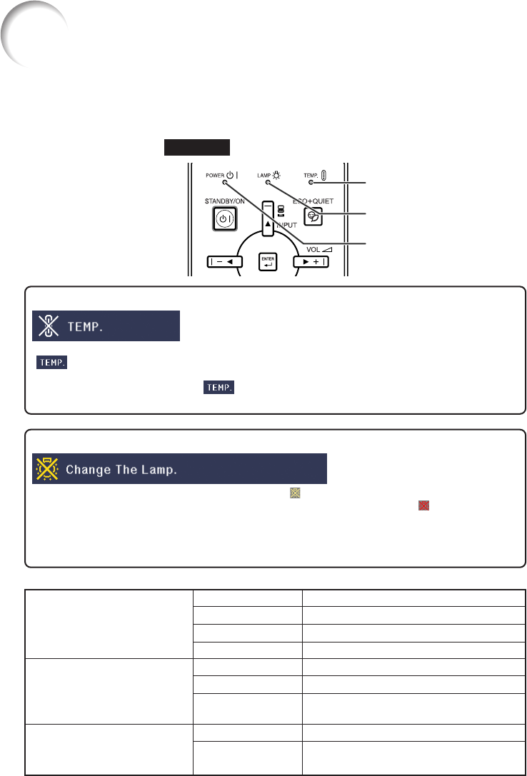 ■ The warning lights (power indicator, lamp indicator and temperature warning indicator) on the
