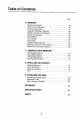 Table of Contents PAGE 1. INTRODUCTION FYoucanmtWail ..ovv oo 1 Precautions on Use .. 2 Accessories Included . 3 Part Names and Functions 4 Keyboard ata Glance 6 2. GETTING STARTED Platen Knob . 10 Top Cover 11 Removing the Pack mg Rod . 1t Switching On A 3 Correction Tape . 13 Print wheel 15 Ribbon Cartridge 17 3. USING THE DISPLAY Aging the Display 18 Display Contrast 19 4, SETTING PAGE FORMATS Inserting the Paper . ..ovvvurearneaaenriaanens 20 Moving the Paper .2 Selecting the Line Spacing . .