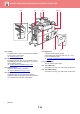 BEFORE USING THE MACHINE►BEFORE USING THE MACHINE (20) (21) (22) (23) (25) (20) Finisher (large stacker)* (24) (26) (27) (28) (29) (25) Trimming module* This staples paper. A punch module can also be installed to punch holes in output paper. ► FINISHER (LARGE STACKER) (page 1-139) This trims the excess of saddle-stitched output. (26) Folding unit* This folds and outputs paper. (21) Saddle stitch finisher (large stacker)* (27) Curl correction unit* This staples and folds paper.