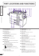 I PART LOCATIONS AND FUNCTIONS GETTING STARTED Exterior q w e rt y u io !0 !1 !2 !3 !4 !5 !6 Part locations and functions @0 @1 q Exit tray (optional) Finished copies are deposited here. !0 Original guides Adjust to the size of the original. w Paper clip tray Place paper clips here. !1 Power switch Press to turn copier power on and off. e Operation panel Contains all operation keys and indicators. !2 RADF tray Holds up to 50 originals.