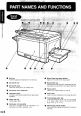 PART NAMES AND FUNCTIONS Lila ity lilo AR} SUZHOU) PUE SEUSS Ugy @ Handles @ Roller rotating knobs Turn to remove missed paper. (® Side paper cassette Holds 500 sheets of paper. @ Transport lever Turn o open the transport section. @ Photo conductive drum Copy images are formed on the photo conductive & Toner collecting container cum. Used toner is collected sere. Replace when the indicator blinks. @ Corona unit The unit is used to charge the photo conductive Accessories drum. Paper casserole. tray .