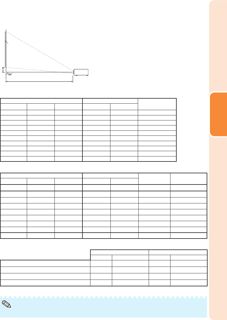 When using the projector with screen sizes not listed in the above charts, calculate the values according to the formulas.