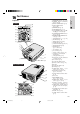 Part Names Front View 8 1 9 2 0 3 q w 4 e 5 r 6 t 7 y u i o a s p d Side and Rear View g h f j k l : a ; s J d f K 1 POWER indicator [pp. 18, 19, 38] 2 POWER buttons (ON/OFF) [pp. 18, 19, 39] 3 BLACK SCREEN button [p. 30] 4 INPUT SELECT button [pp. 19, 26] 5 FREEZE button [p. 33] 6 KEYSTONE button [p. 14] 7 ADJUSTMENT buttons (∂ /ƒ/ ß / ©) [pp. 14, 20–36, 40] 8 LAMP REPLACEMENT indicator [pp. 18, 19, 38] 9 TEMPERATURE WARNING indicator [pp. 4, 38] 0 VOLUME buttons (Ⳮ/ⳮ) [p.
