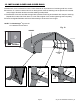 12. INSTALLING COVER AND COVER RAILS A. Make sure cover is centered on frame. There should be an equal amount of overhang at all four corners. B. Insert the “S”- Hook on ratchet into hole on the leg bend. Insert the webbing into the spindle of the ratchet and pull tight. Wind the ratchet so that the webbing overlaps itself. C. Disassemble cover rails and slide through fabric pockets at each leg and reattach with clamps to each leg. Repeat this on other side.