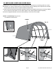 10. INSTALLATION DES PANNEAUX DE PORTE ET DE BOUT A. Tenez le panneau en haut et au centre avec la partie blanche vers l’intérieur de l’abri. Entourer le bord de la toile autour de l’ossature et passez les tubes au travers de la fente déjà coupée dans la toile. B. Débrancher rail du haut (les tuyaux horizontaux qui vont de l'avant vers l'arrière le long du haut) de la nervure fin. Tirez sur la sangle (la sangle noire) ci-dessous la traverse. Remettez le rail traverse supérieure de la nervure fin.