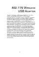 802.11N Wireless USB Adapter Features • IEEE802.11n compliant • Wireless speeds up to 300 Mbps with 40 MHz operating mode • Increased speed and coverage - up to 15 times the speed of IEEE 802.11g • Fully backwards compatible with 802.