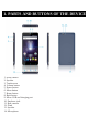 1. PARTS AND BUTTONS OF THE DEVICE 1 .Front camera 2. Speaker 3. Touchscreen 4. Volume button 5. Power button 6. Menu button 7. Home button 8. Back button 9. Micro USB and charging port 10. Earphone jack 11. Rear camera 12. Flash 13. Speaker 14.