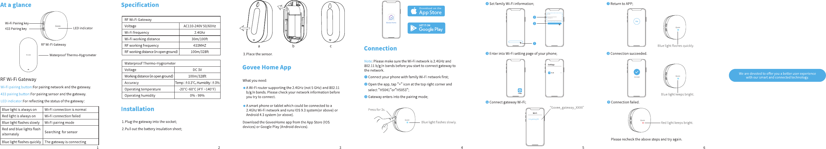 --.-'F 0 Controlling your devices with the Govee -- -¾ . ' ` Using your device Homeapp. Alarm me [气 8 Add sensor 1. Gateway enters into the pairing mode. a. Product supports only 2.4 GHz (not 5 GHz) network. """ "�···•'';� Warning 1. Please ensure that the product works within the specified temperature and humidity range. 2. Please do not violently disassemble the product d. Reduce barriers like metal door or multiple / heavy walls, gateway and the router in 30 meters (100ft).